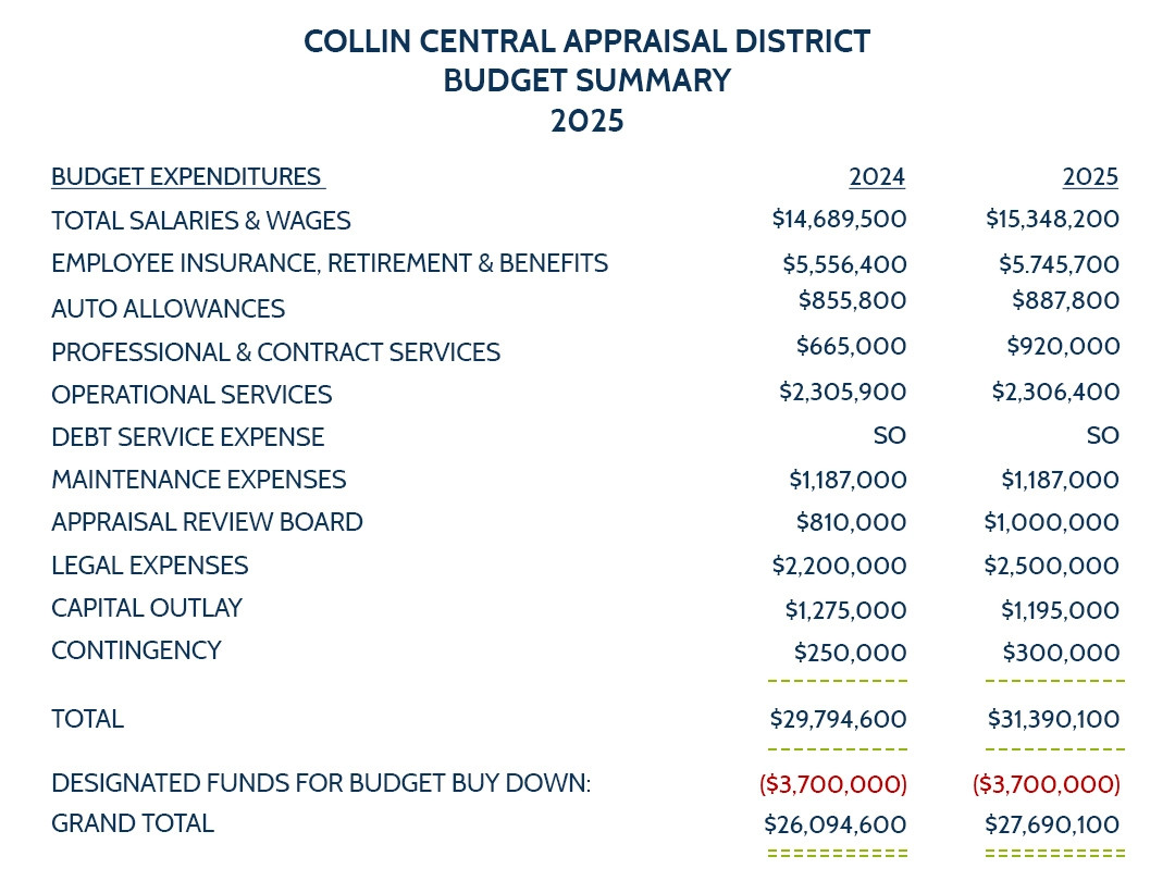 The 2025 Collin CAD budget reflects targeted increases in spending to enhance appraisal accuracy and operational efficiency.